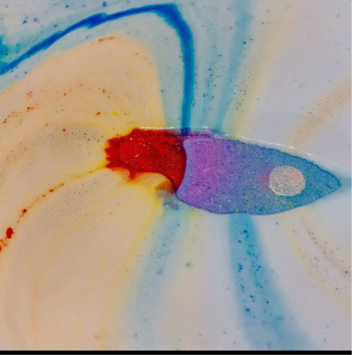 Our Blast Off bathbomb turns your bath into a galaxy of colours, with swirls of blue, yellow and red and a sweet Candy Hearts scent of orange, grapefruit and lemon mixed with sweet vanilla.